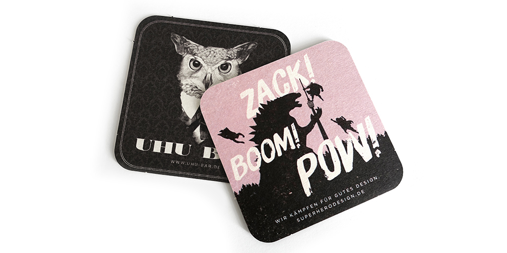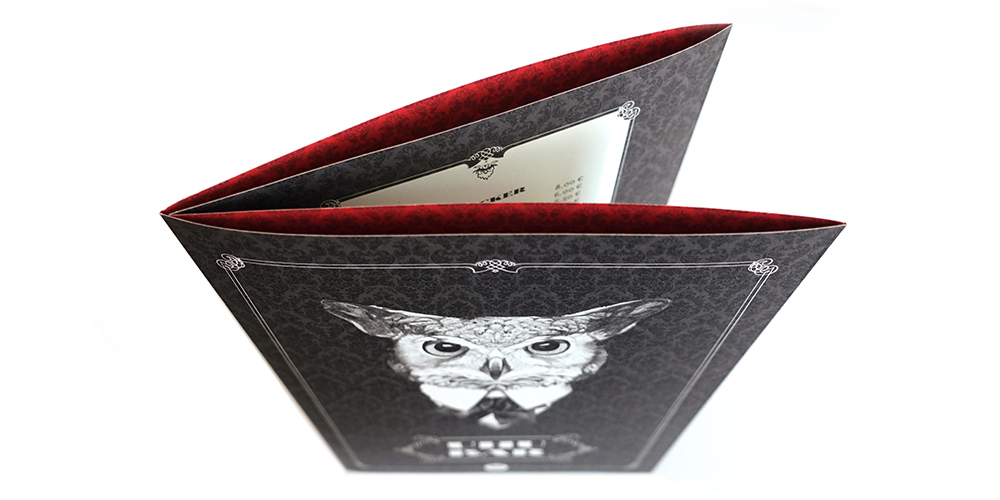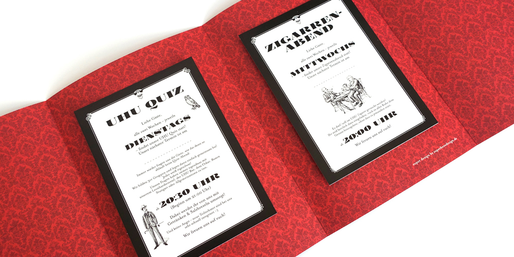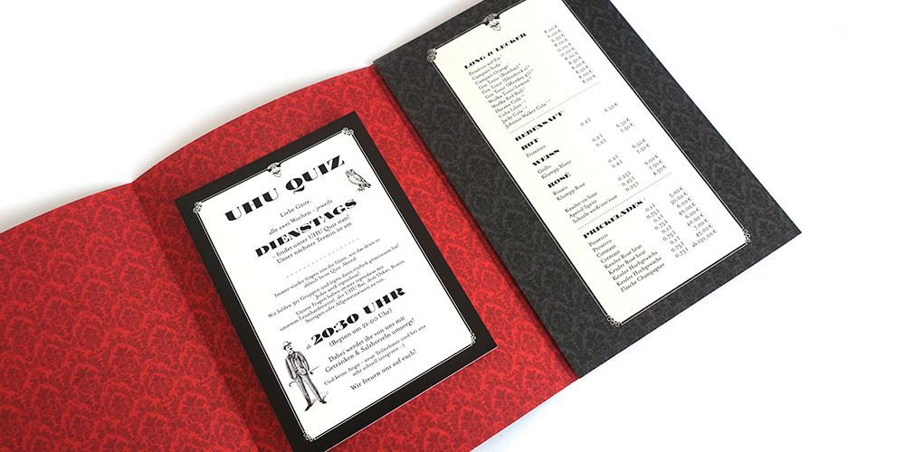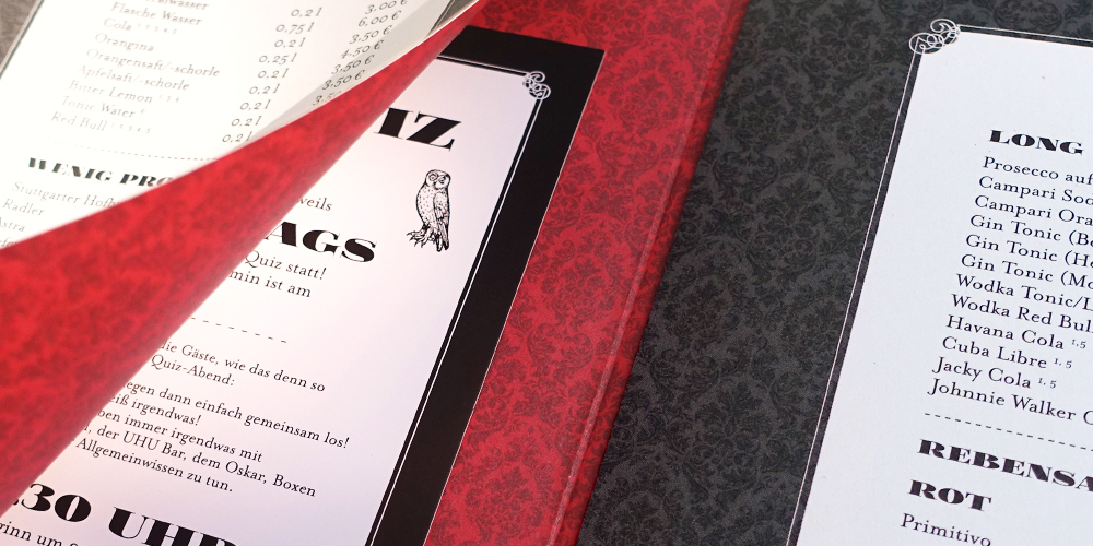 Die berühmte Uhu-Bar im Stuttgarter Rotlichtviertel ist ein besonderer Ort. Nicht jeder darf da rein. Die von uns gestaltete Getränkekarte mit barocken Ornamenten auf rotem Hintergrund zitiert das gemütliche Interieur und interpretiert die spannende Mischung aus Style, Stil und Rotlicht. Die Innenseiten der Karten bieten übrigens Platz für die Info-Kärtchen zweier legendärer Uhu-Kultabende, der Quiz-Nacht und des Zigarrenabends.